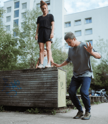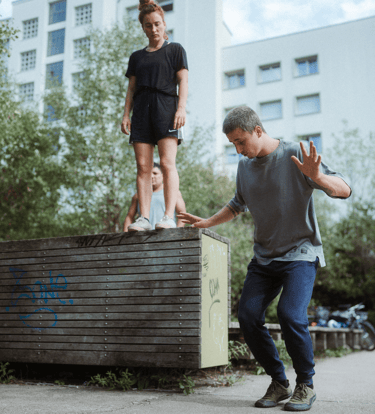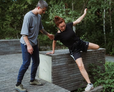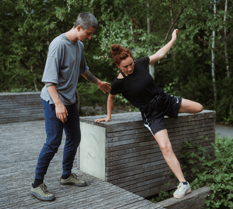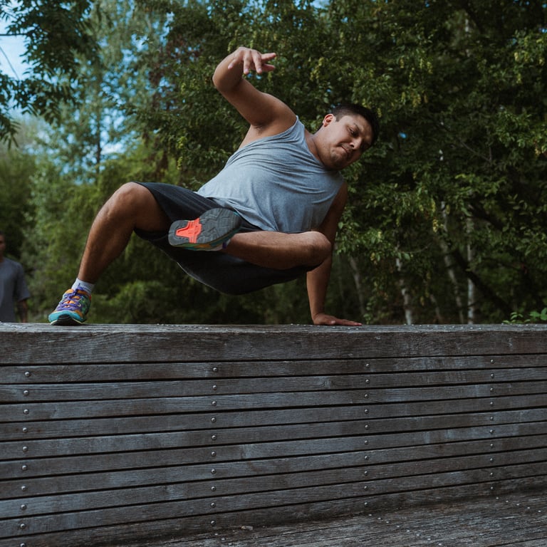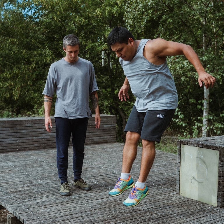 Depuis 2019, j'ai pu développer mes compétences à l'école de Parkour Kimeo ainsi qu'au Campus Univers Cascade. Je vous propose une approche douce, avec peu d'impacts, axée sur la prise d'appuis (pieds, mains, dos), la fluidité et l'équilibre.